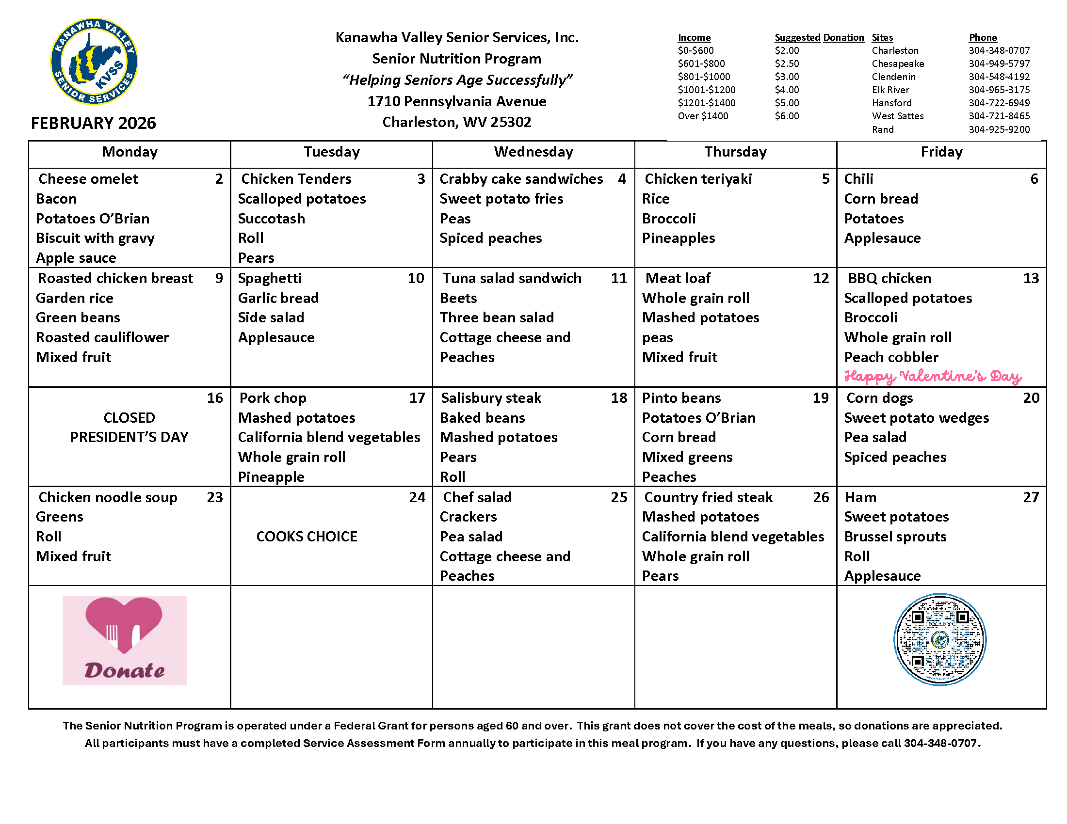 MONTHLY ACTIVITIES: BINGO every 2nd and 4th Friday of the month at 10:30 AM, Crafting every 1st and 3rd Friday of the month at 10:00 AM, Sitting Fit every Monday and Tuesday at 10:30 AM, Strength Training every Tuesday at 10:30 AM, ZUMBA every Wednesday at 10:00 AM, Tai Chi Advanced Tuesdays and Thursdays at 1:30 PM, Tai Chi Beginner Tuesdays and Thursdays at 2:45 PM, Qigong Wednesdays and Fridays at 2:00 PM. Meals are served Monday-Friday at 11:45 AM. Suggested donation for the meal is $2.00. KVSS will be closed February 16th for Presidents Day. Join us on February 13th at 11:00 AM for WVSU Biochar workshop (call to reserve a spot), followed by our Valentine Lunch. Join us February 27th at 11:30 AM for a Tobacco Education class.